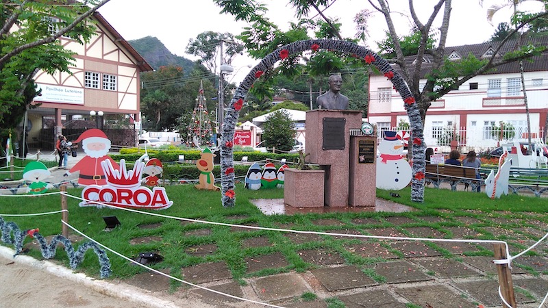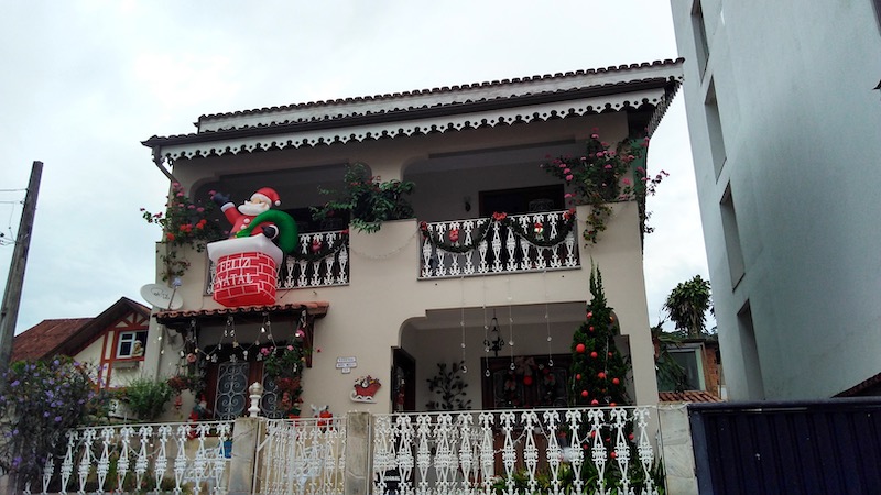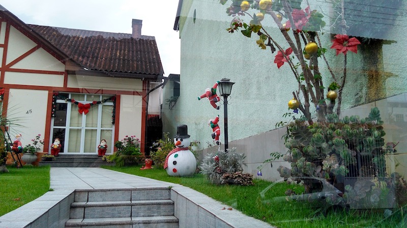 Assim como outras regiões serranas, o ponto alto do turismo na cidade é quando as temperaturas caem e o frio toma conta, deixando aquele clima misterioso da neblina que encobre as montanhas ao redor. Além disso, o centro de Domingos Martins fica especialmente charmoso em época de Natal. Várias casas ao redor embalam no clima natalino e caprichem nos enfeites. Eu até encontrei a cada do Papai Noel!